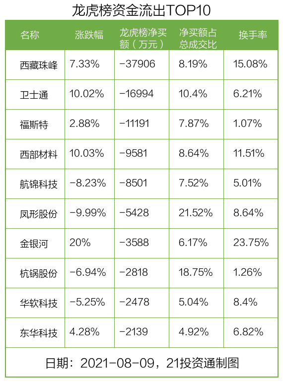 而龙虎榜中资金净流出最多的是西藏珠峰(600338.SH),被净卖出为3.79亿元,占总成交金额的8.19%。西藏珠峰收盘上涨7.33%,换手率为15.08%。
