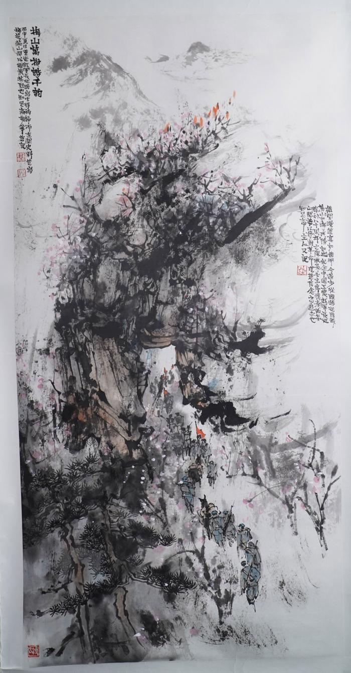 2017年夏天,我参加了“重走红军长征路”写生团,重点考察了粤北红色革命遗址,也实地感受了乌迳新田。作品《长征·梅岭》以中国山水画的形式艺术地再现红军长征的史实。这是本人的长征系列作品之一。