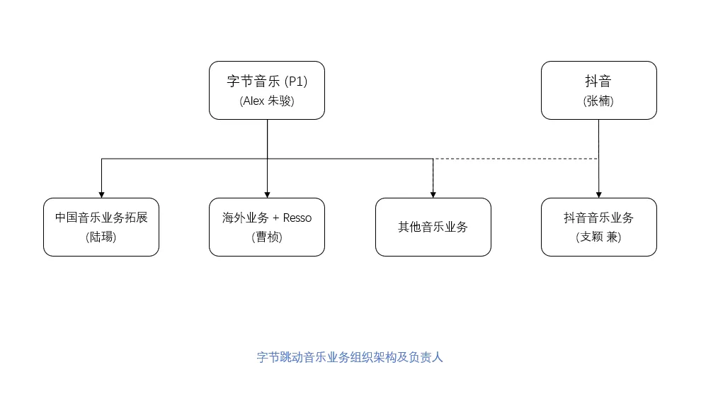 在今年,字节跳动已经成立音乐事业部。据接近字节音乐业务的知情人士向音乐先声透露,目前字节音乐业务旗下设立了三个相关业务组:陆瑒负责中国音乐业务拓展,其中包括版权合作、内容厂牌(即银河方舟)、投资和推广等;曹桢负责Resso和海外业务;支颖负责抖音音乐。