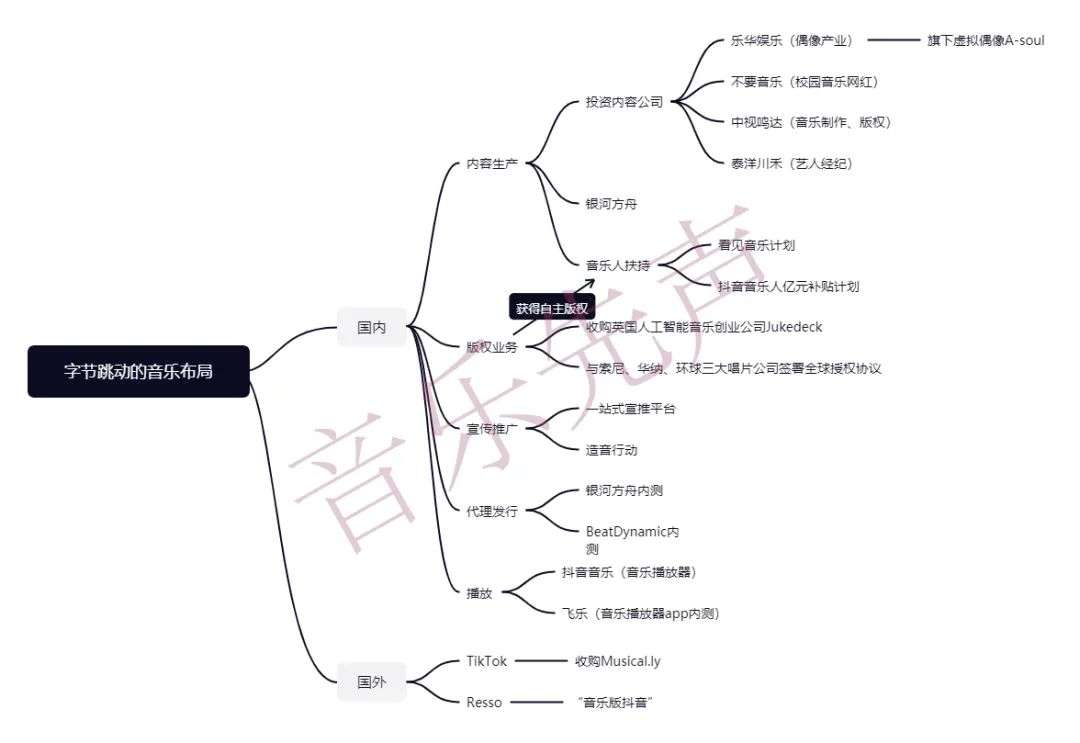 回顾字节跳动入局音乐市场的路子,包括播放、内容生产、宣发、版权运营这些音乐产业链的关键节点,一个不落。