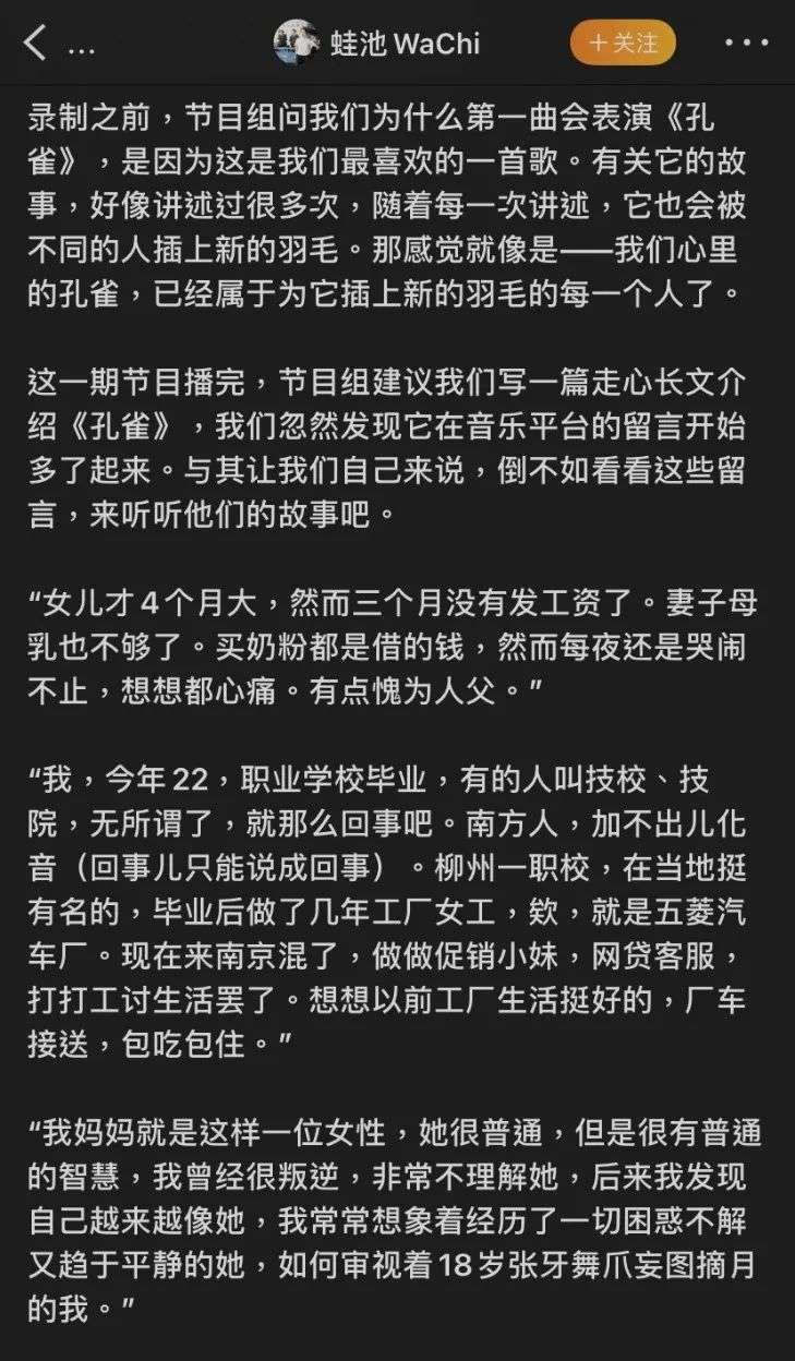 在《草莓星球来的人》舞台首秀上,蛙池乐队带来的歌曲《孔雀》,人物原型取样自周屋工业区的女人,描述她们流水线上流转着的岁月,引发了相关的话题讨论。他们也随后在官方微博引用网易云音乐下的歌曲评论介绍《孔雀》这首歌,并写下“我们心里的孔雀,已经属于为它插上新的羽毛的每一个人了。”这大概是作为以图文为核心的网易云音乐社区不可被替代的部分,也是短视频内容无法传达的感受。