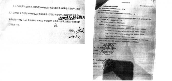 华铁应急提供的澄清说明附加材料显示,该影印文件标明“浙江亿邦发到乌海西来峰机房的25000台云计算服务器由裴金泰签字的签收单、浙江亿邦发到俄公堡机房的16000台云计算服务器由刘凯签字的签收单、浙江亿邦发到木里布拖机房的14000台云计算服务器由郑斌签字的签收单今起作废,改由浙江纽博实业有限公司授权陈宝清签字的56000台签收单替代”,署名为证明人:章浩,日期为2018年10月25日。