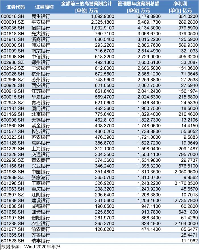 南财全媒体记者 吴霜 上海报道 Wind数据显示,2020年民生银行管理层年度薪酬总额为6179.89万元,位列40家A股上市银行中的第一位。而其包括少数股东权益的净利润则是351.02亿元,位列第12。