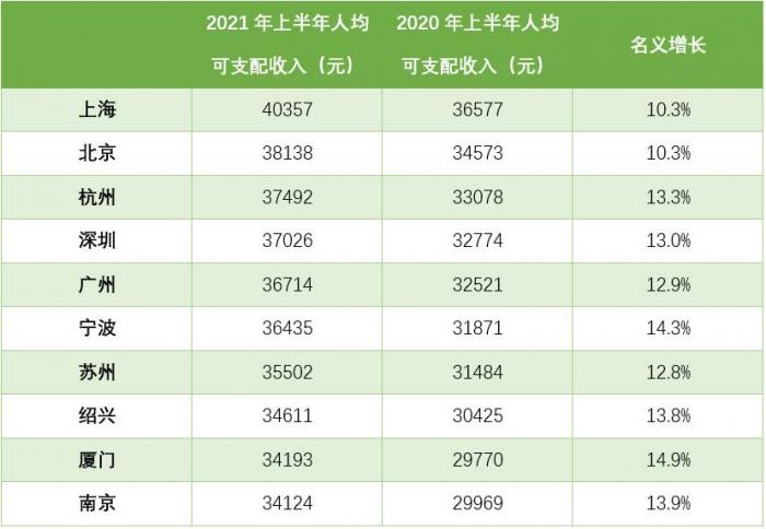 上半年人均可支配排名前十的城市