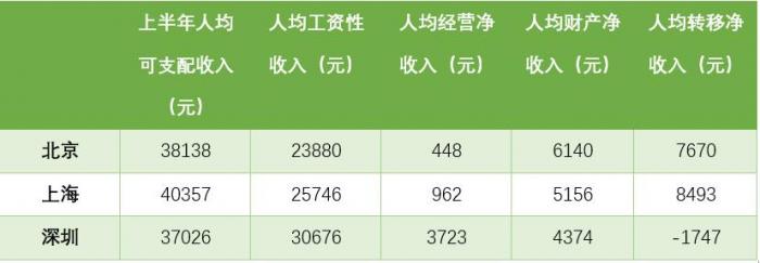 深圳的收入结构与北京、上海迥异。上半年深圳人均工资性收入30676元,名义增长15.7%;人均经营净收入3723元,增长5.3%,反映了深圳中小、个体经济相比北京、上海更为活跃;人均财产净收入4374元,增长6.4%;人均转移净收入为-1747元,2020年同期为-1386元。