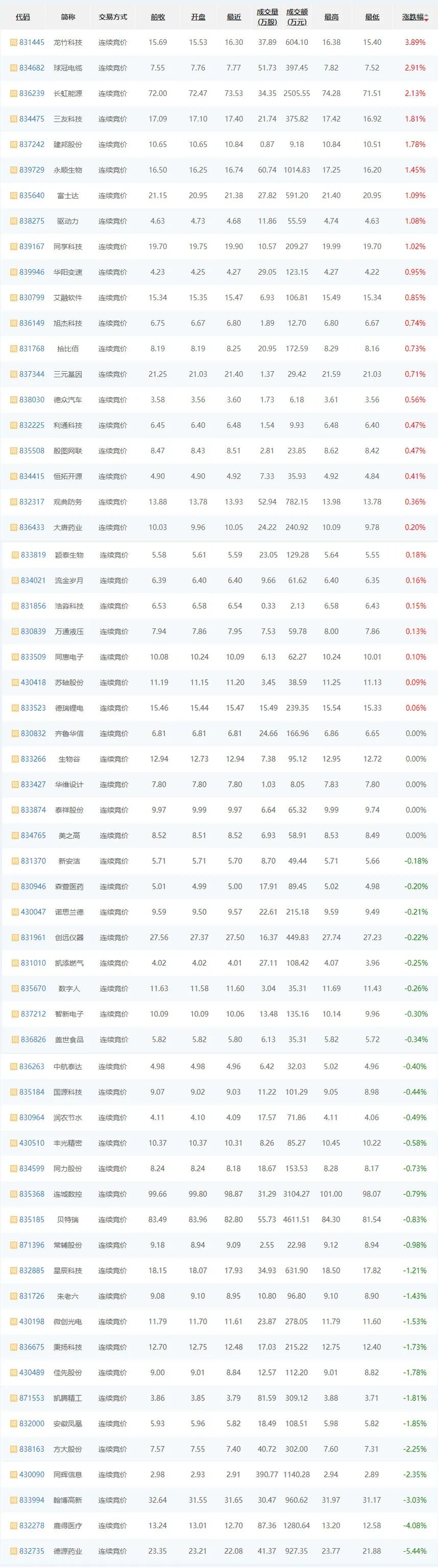截至8月10日收盘,今日成交金额为6.10亿元,精选层成交金额为2.40亿元,创新层成交金额为2.33亿元,基础层成交金额为1.38亿元;今日成交股数为8186.55万股,精选层成交股数为1577.63股,创新层成交股数为3346.03万股,基础层成交股数为3262.90万股。