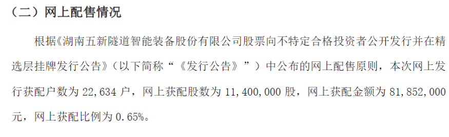 8月10日,全国股转网站显示,五新隧装发行结果出炉。