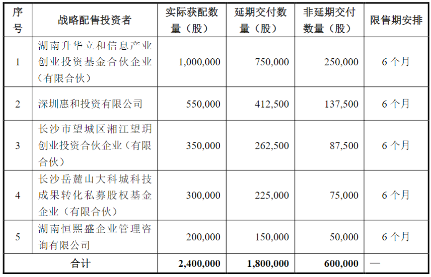 战略配售方面,本次公开发行五新隧装成功引入5名战略投资者,发行战略配售股份合计240万股,占初始发行规模的20%(不含超额配售部分股票数量),发行价格为7.18元/股,战略配售募集资金金额合计1723.20万元。