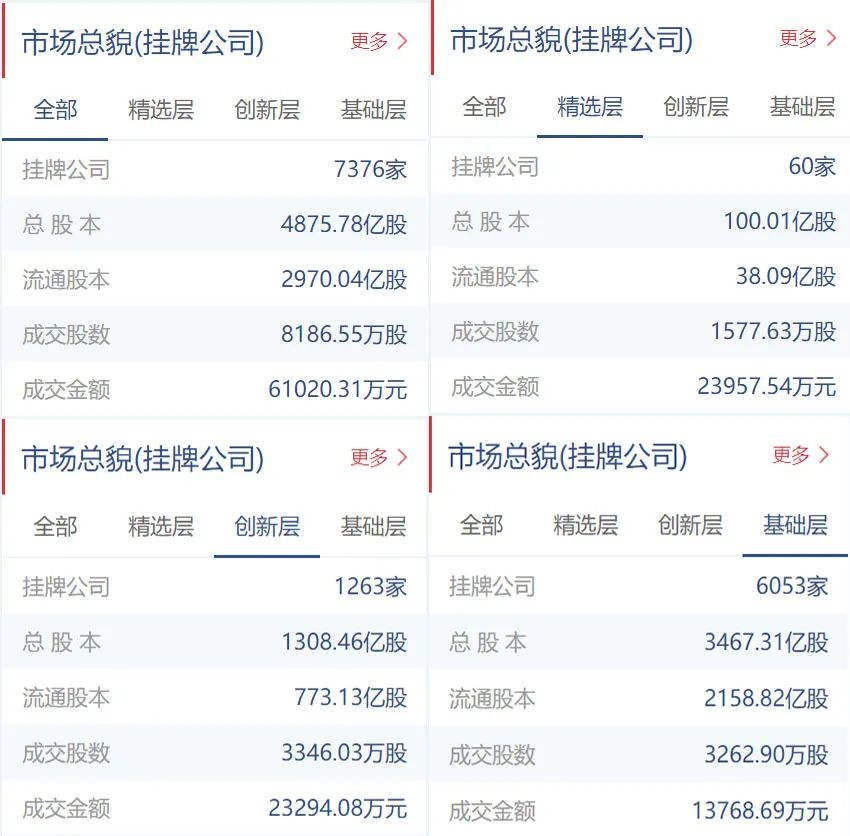新三板挂牌公司总计7376家(精选层60家,创新层1263家,基础层6053家),总股本4875.78亿股,流通股本2970.04亿股。