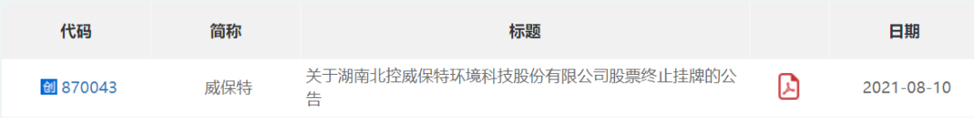 全国股转公告:近期,湖南北控威保特环境科技股份有限公司向我司提交了终止股票挂牌的申请。根据《全国中小企业股份转让系统业务规则(试行)》的规定,我司现决定自2021年8月11日起终止其股票挂牌。特此公告。