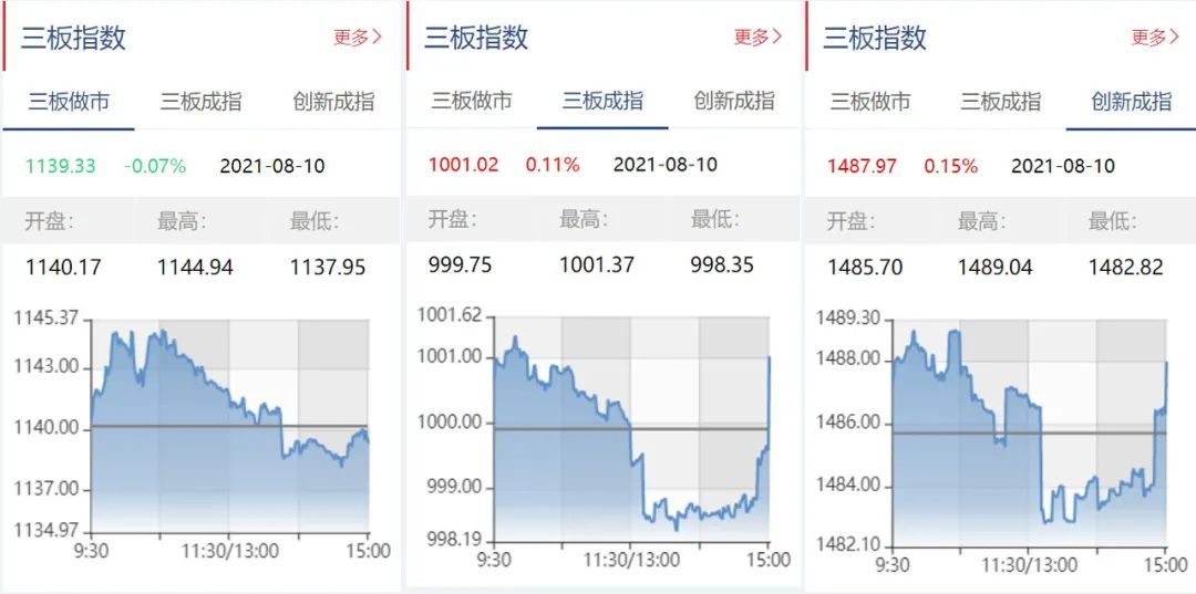 截至8月10日收盘,三板做市报1139.33点,下跌0.07%;三板成指报1001.02点,上涨0.11%;三板创新报1487.97点,上涨0.15%。
