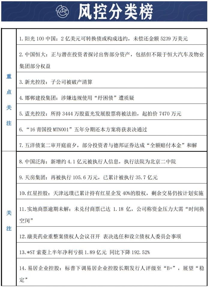 阳光100中国2亿美元可转换债或构成违约;中国恒大正与潜在投资者探讨出售部分资产;邯郸建投集团涉嫌违规使用“纾困债”遭质疑丨预警内参(第十三期)