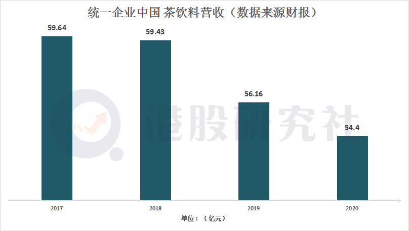 但不能忽视的是,仅从营收体量来看,统一茶饮料收入几乎处于增长停滞的状态。数据显示,统一2017年茶饮料收入为59.64亿元,2019年为56.16亿元,2020年下滑至54.40亿元,反观老对手康师傅却处在增长的状态,2017年茶饮料收入为151.80亿元,2019年为155.79亿元。
