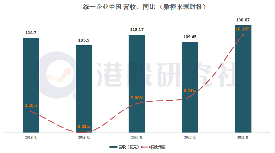 从最新披露出的财报显示,2021年H1,统一营收实现130.7亿元,相比去年同期增长10.1%,但低于市场以及投资机构分析预期营收同比的10.8%。