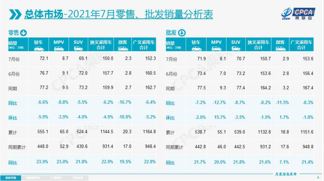 8月11日,资本邦了解到,8月10日,全国乘用车市场信息联席会(以下简称“乘联会”)公布了7月乘用车销量。