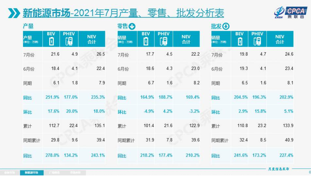 1-7月,新能源乘用车批发133.9万辆,同比增长227.4%,零售122.9万辆,同比增长210.2%。