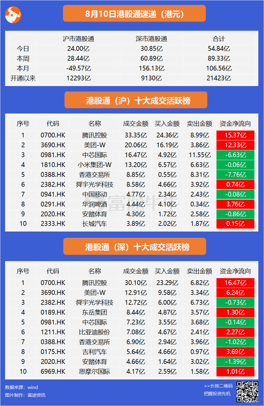 南向资金昨日净买入54.84亿港元,连续3日净买入。腾讯控股、美团、华润啤酒分别获净买入31.84亿港元、18.57亿港元、3.76亿港元。净卖出方面,香港交易所、中芯国际、安踏体育分别遭净卖出8.78亿港元、6.77亿港元、2.24亿港元。