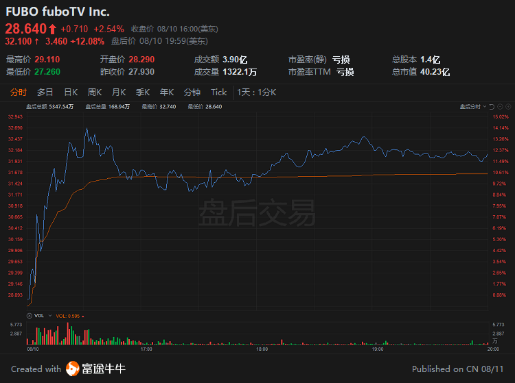 财报公布后,FuboTV盘后涨12%,报32.1美元。