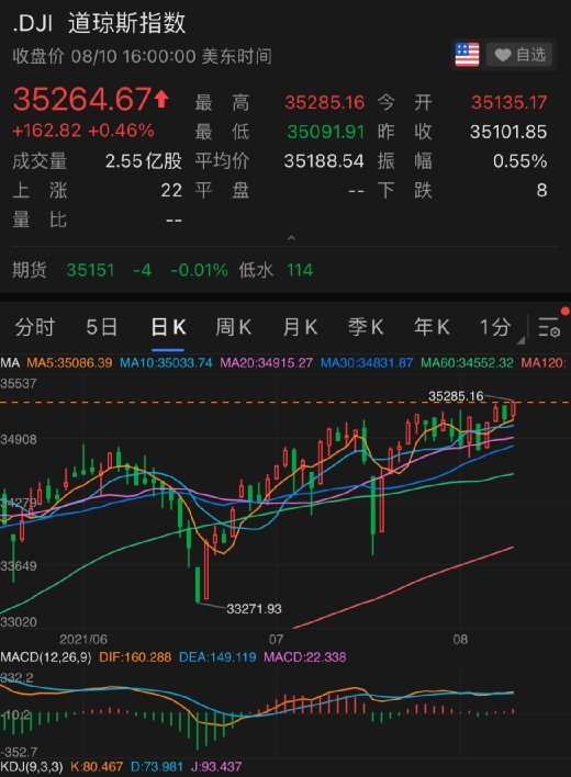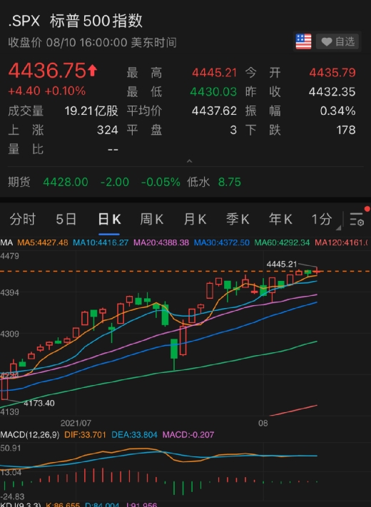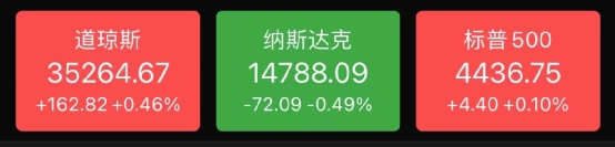 截至收盘,标普500指数涨0.10%,报4436.75点;纳斯达克指数跌0.49%,报14788.09点;道琼斯指数涨0.46%,报35264.67点。