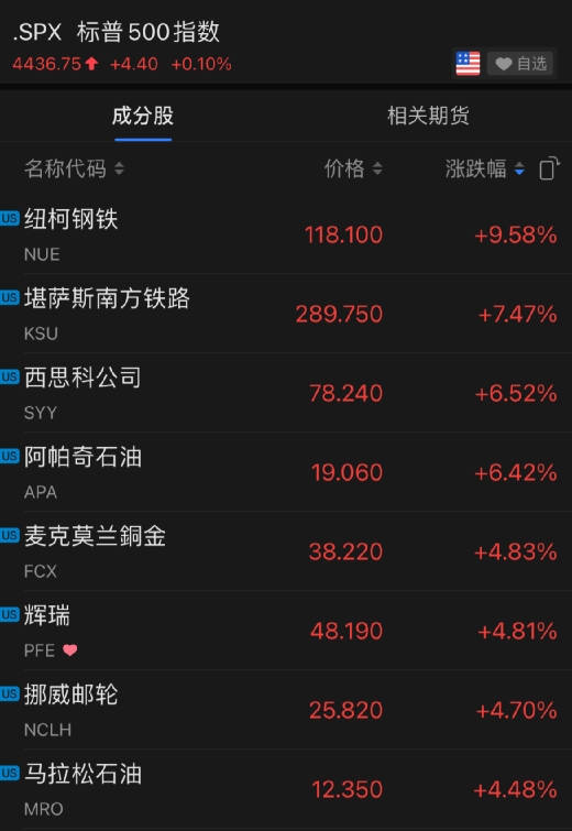 标普500成分股中,纽柯钢铁大涨9.58%,领涨标普500成分股。此外,堪萨斯南方铁路涨7.47%,阿帕奇石油涨超6%,麦克莫兰铜金涨近5%,马拉松石油涨4.48%。
