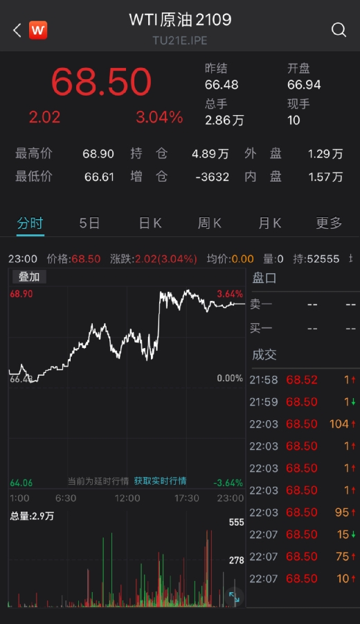 据Wind数据,WTI原油期货盘中一度涨近4%,收涨超3%。