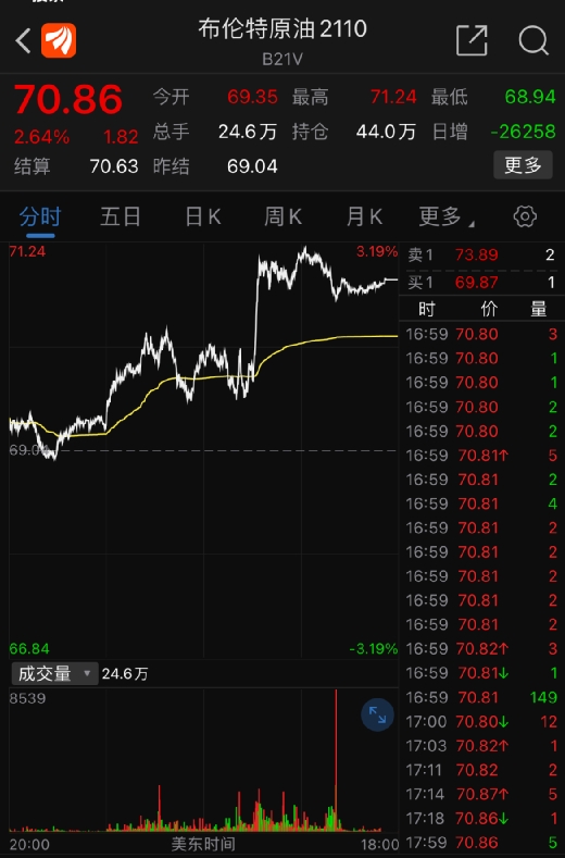 据东财数据,布伦特原油期货盘中一度涨超3%,收涨2.64%。