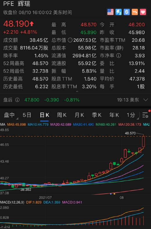 辉瑞盘中一度涨超5%,收盘上涨4.81%,股价创下历史新高,市值飙升124亿美元,约合804亿人民币。
