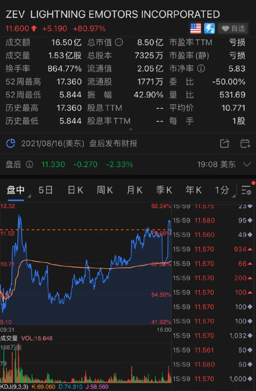 此消息一出,Lightning eMotors立马大涨,盘中一度涨近90%,收盘涨幅达80.97%,创正式上市以来新高。