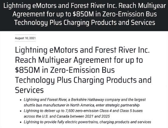 当地时间8月10日,车队专用电动汽车供应商Lightning eMotors宣布已经和伯克希尔哈撒韦的子公司Forest River签订了一项战略合作协议,计划在2021至2025年期间部署多达7500辆零排放穿梭巴士。