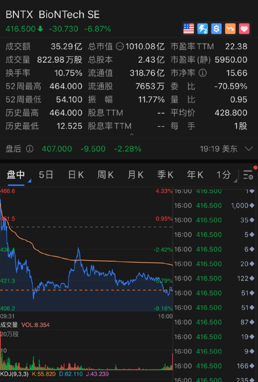 除Moderna外,周一大涨15%的Biontech也大跌,收盘跌近7%。