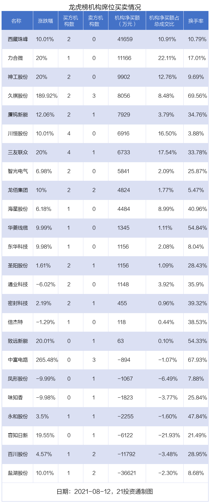8月12日,24只个股龙虎榜出现了机构的身影,机构合计净买入5.24亿元。具体来看,机构净买入17股,净卖出7股。