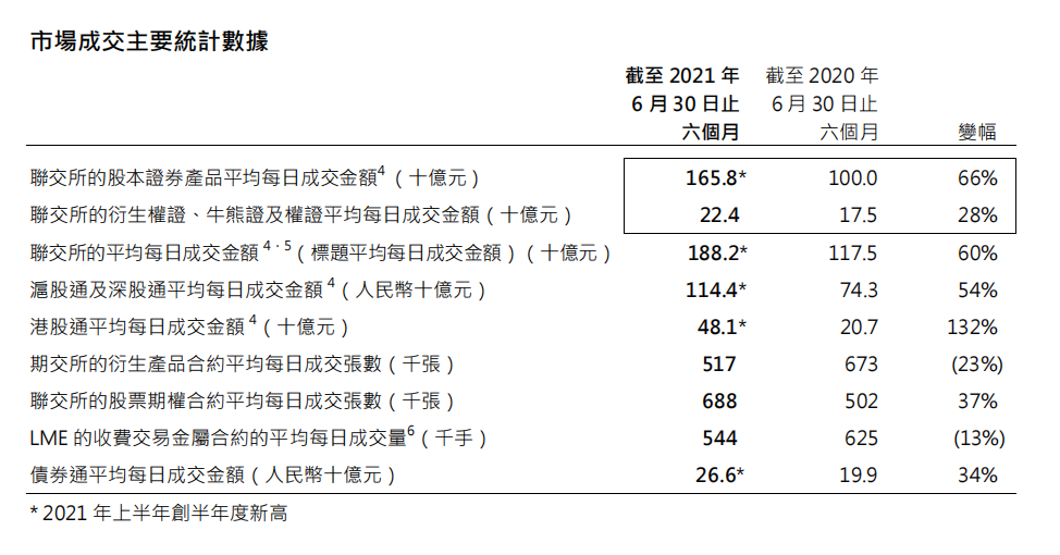 今年上半年,港股现货市场、衍生产品以及定息及货币产品表现强劲,其中现货市场平均每日成交金额同比激增60%至1880亿港元。