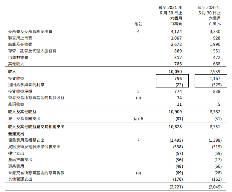财报显示,港交所营收和净利润均获得双位数增长。截止2021年6月30日的上半年,港交所期内收入及其他收益达到109.09亿港元,同比增长24%;净利润为66.1亿港元,同比上升26%。