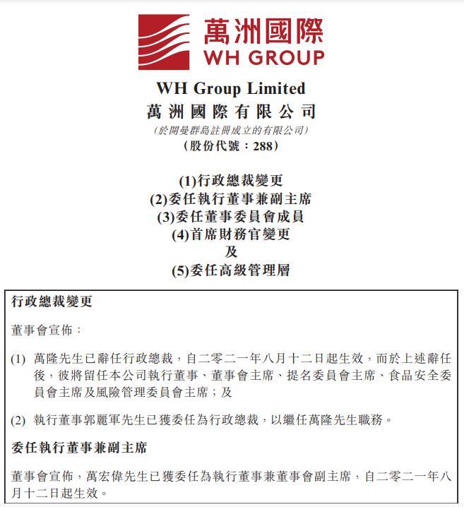 8月12日,港股万洲国际公告,万隆已辞任行政总裁,将留任本公司执行董事、董事会主席、提名委员会主席、食品安全委员会主席及风险管理委员会主席。执行董事郭丽军已获委任为行政总裁,以继任万隆职务。