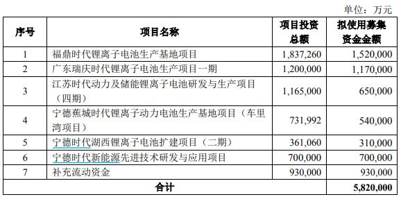 此次计划募集的582亿元资金中,除了93亿元用于补充流动资金外,剩余部分亦主要加码公司产能,具体包括三大投资超过百亿的福鼎时代锂离子电池生产基地项目(60GWh)、广东瑞庆时代锂离子电池生产项目一期项目(30GWh),以及年产能同为30GWh的江苏时代动力及储能锂离子研发与生产项目(四期)。