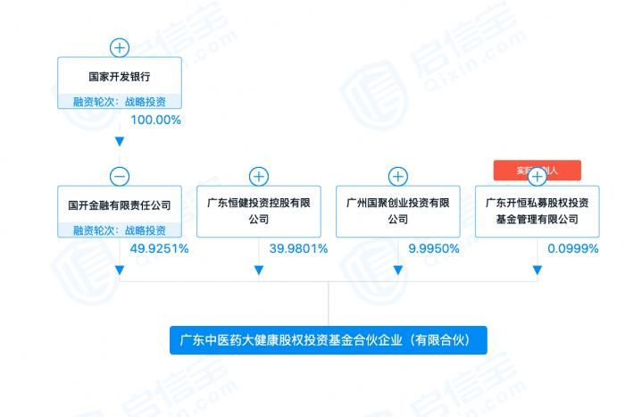 启信宝查询显示,广东中医药大健康基金全称为广东中医药大健康股权投资基金合伙企业(有限合伙),于2021年6月25日成立,大股东为国开金融,持股49.9251%;广东恒健持股39.9801%,为第二大股东;其次为广州开发区旗下的广州国聚创业投资有限公司持股9.9950%;广东开恒私募股权投资基金管理有限公司持股0.0999%,并负责基金管理。