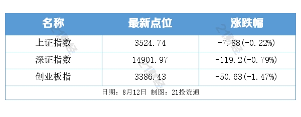 8月12日,A股三大股指集体收跌,创业板指跌近1.5%。锂电近20股涨停或涨幅超10%,盐湖股份午后涨停。国防军工、饮料制造、房地产跌幅居前。