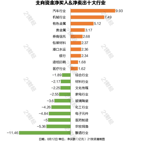 北向资金减持了29个行业,其中酿酒行业最多,净卖出金额达11.46亿元,其次是农牧饲渔行业,净卖出5.36亿元。