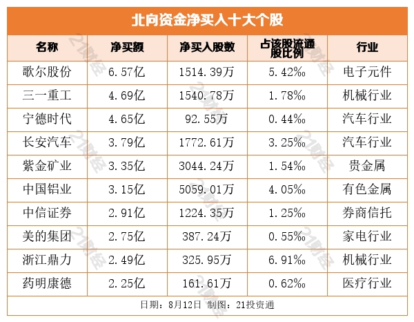个股方面,北向资金净买入歌尔股份(002241.SZ)、三一重工(600031.SH)、宁德时代(300750.SZ)、长安汽车(000625.SZ)、紫金矿业(601899.SH)居前,净卖出格力电器(000651.SZ)、贵州茅台(600519.SH)、恒瑞医药(600276.SH)、牧原股份(002714.SZ)、中国巨石(600176.SH)居前。