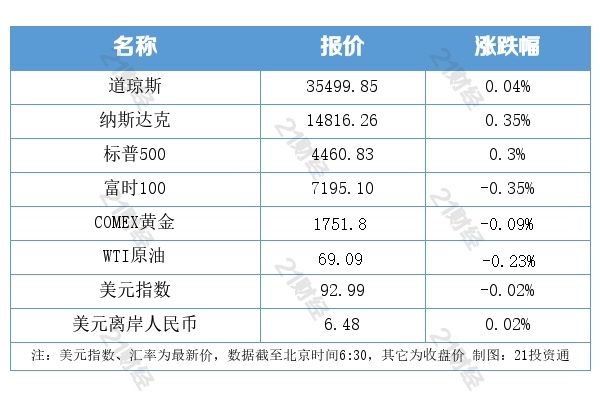 美股小幅收涨,道指与标普500指数再创历史新高。大型科技股多数上涨,苹果、特斯拉涨超2%,微软涨1%。疫苗股集体走高。
