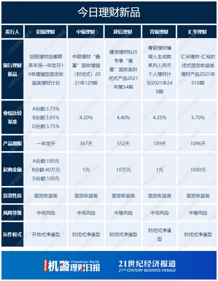 《机警理财日报》是南财理财通、21世纪经济报道旗下投资理财专栏,旨在帮投资者守好“钱袋子”。课题报道组长期关注银行理财,并搭建独有理财数据库,欢迎申请试用。本专栏每日内容各有侧重,周一聚焦固收+产品、周二纯固收产品、周三现金管理类产品、周四混合类产品、周五权益类产品,每周一至周五更新,移动端内容尽在21财经APP,平面内容尽在《21世纪经济报道》报纸【南财理财通】专栏,敬请关注!
