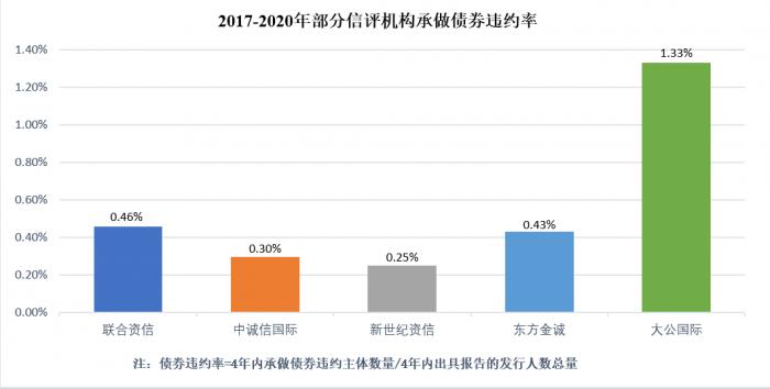 据有披露的业务数据显示,大公国际的违约率排名第一,为1.33%,四年内出具报告的发行人数量1505家,主体违约数量20家;紧随其后的是联合资信,违约率达0.46%,主体违约数量13家;其次是东方金诚,违约率0.43%;再次是中诚信国际,违约率为0.30%。另外,标普信评、中债资信等违约率为0。
