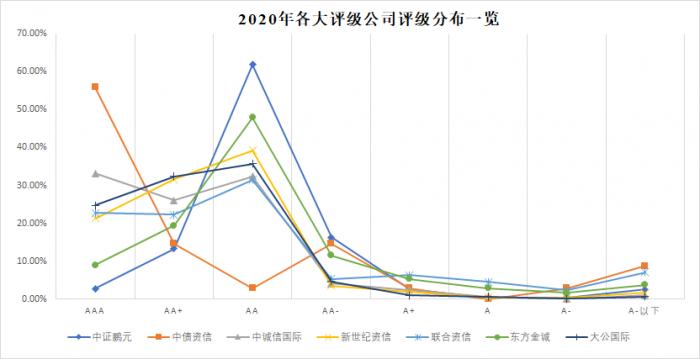 南财全媒体记者统计了2020年末国内各评级公司的评级分布情况发现,信评机构的评级结果集中在AA级,相较之下中债资信评估有限责任公司(下称“中债资信”)评级区分度最高。