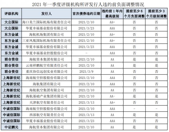 据银行间交易商协会发布信息显示,2021年一季度共有18起债券违约,17起违约前债项评级最高级别都在AA级及以上。其中,东方金诚对4家所评发行人违约前至少6个月未进行负面调整,提前至少3个月未进行级别调整;上海新世纪在1家发行人违约前提前至少6个月进行了负面调整,提前至少3个月进行了级别调整,但另外其承做的4家海航系企业并未提前6个月进行任何风险调整。