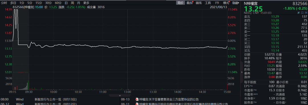 今日盘面,梓橦宫开盘价为13.28元/股,开盘即破发。并全日处于破发状态,今日最高价13.47元/股,最低价13.12元/股。