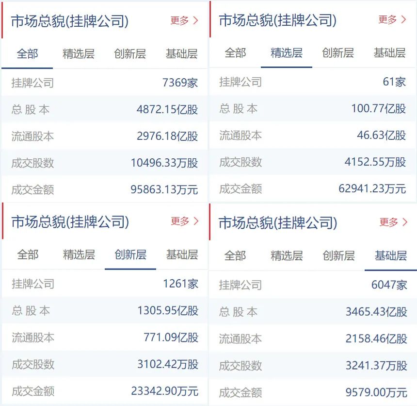新三板挂牌公司总计7369家(精选层61家,创新层1261家,基础层6047家),总股本4872.15亿股,流通股本2976.18亿股。