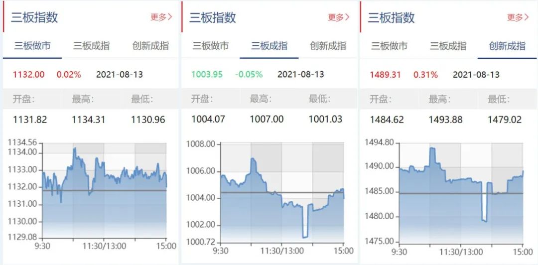 截至8月13日收盘,三板做市报1132.00点,上涨0.02%;三板成指报1003.98点,下跌0.05%;三板创新报1489.31点,上涨0.31%。