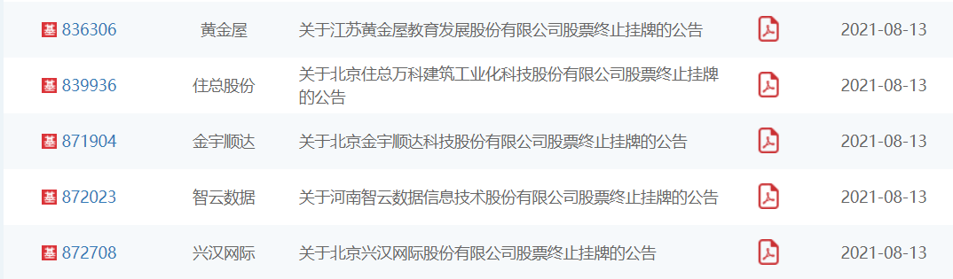 8月13日,新三板基础层公司黄金屋(836306)、住总股份(839936)、金宇顺达(871904)、智云数据(872023)、兴汉网际(872708)终止挂牌。