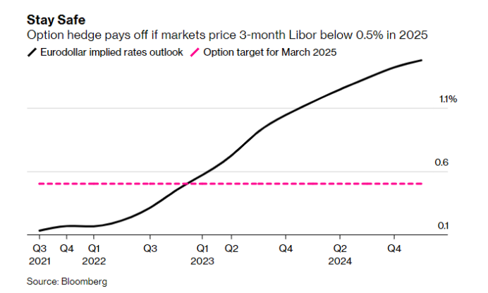 交易员本周一直在忙着抢购欧洲美元的期货看涨期权,这些期权的标的物为2025年3月到期,押注伦敦银行间同业拆借利率(Libor)维持在0.5%以下的期货合约。如果美联储在此之前仍将基准利率维持在较低的区间,那么这些期货期权就会带来回报。目前期货市场预计,直到2025年第一季度,Libor才升至1.47%左右。