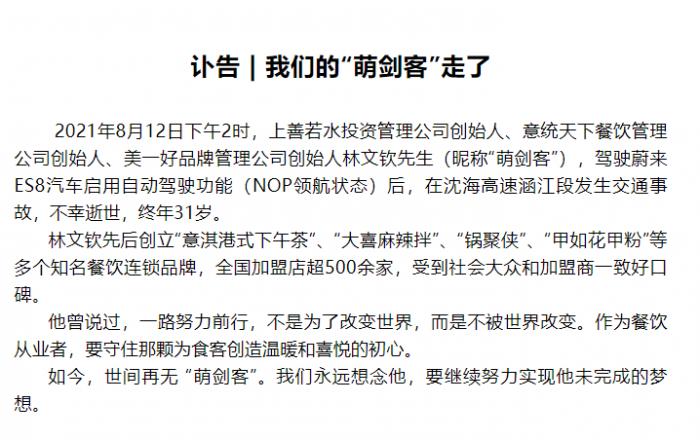 一个认证为“美一好”的公众号发布讣告称,2021年8月12日下午2时,上善若水投资管理公司创始人、意统天下餐饮管理公司创始人、美一好品牌管理公司创始人林文钦驾驶蔚来ES8汽车并启用自动驾驶功能后,在沈海高速涵江段发生交通事故不幸逝世,终年31岁。